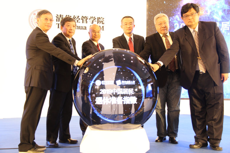 图为清华大学经济管理学院副教授、清华大学经济管理学院党委副书记、副院长钟笑寒(右三)、清华大学经济管理学院教授、中国保险与风险管理研究中心主任陈秉正(左二),全国政协委员、中国社会科学院世界社保研究中心主任、中国社会保障实验室首席专家郑秉文(右二),中国保险行业协会副监事长、副秘书长余勋盛(左三),南开大学金融学院保险学系教授、南开大学卫生经济与医疗保障研究中心主任朱铭来(右一),以及同方全球人寿董事长王林(左一) 共同揭晓2019中国居民退休准备指数