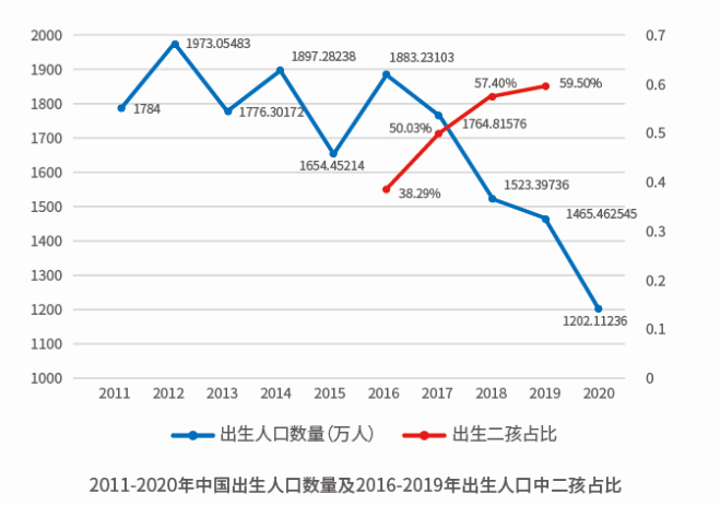 2021年中国老龄化占比达到13.5%,已属于老年型人口国家,并预计在2033年左右成为占比超过20%的超级老龄化社会。与之相比,人口出生率和人口自然增长率却在不断下降,2020年中国人口出生率为8.52‰,人口自然增长率仅为1.45‰。人口出生率的下降与人口老龄化的加深导致我国的老年抚养比在过去十年不断增长,并于2020年接近20%,这意味着每名老年人需要约5名劳动人口抚养。
