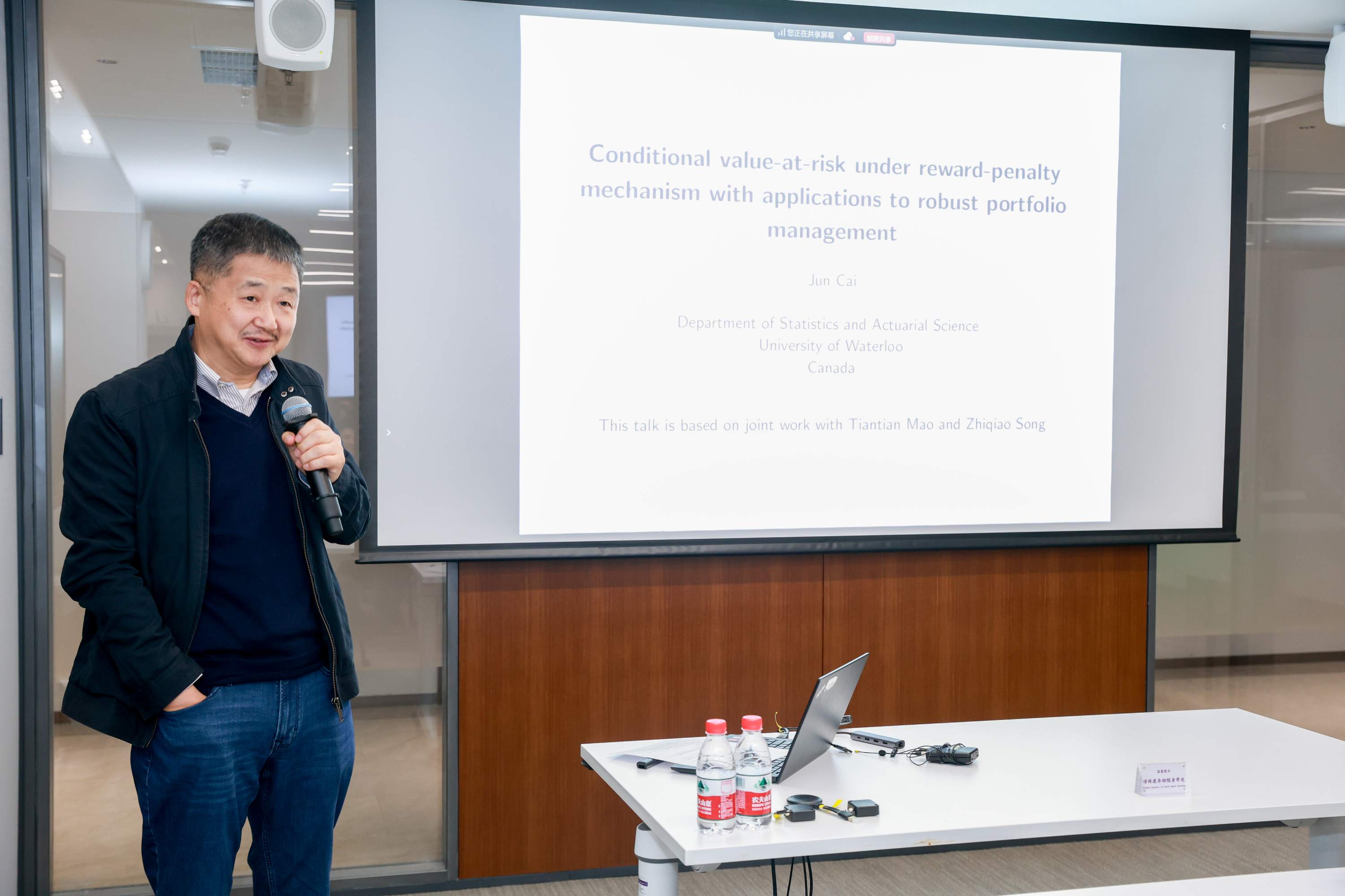 滑铁卢大学统计与精算学系教授蔡军首先带来题为《奖励-惩罚机制下的条件风险价值及其在鲁棒投资组合管理中的应用》的报告。他提出了一种新的鲁棒投资组合选择模型,通过引入奖励-惩罚机制,最小化最坏情况下的条件在险价值(CVaR),并展示了该方法在实际市场数据中的优越表现。