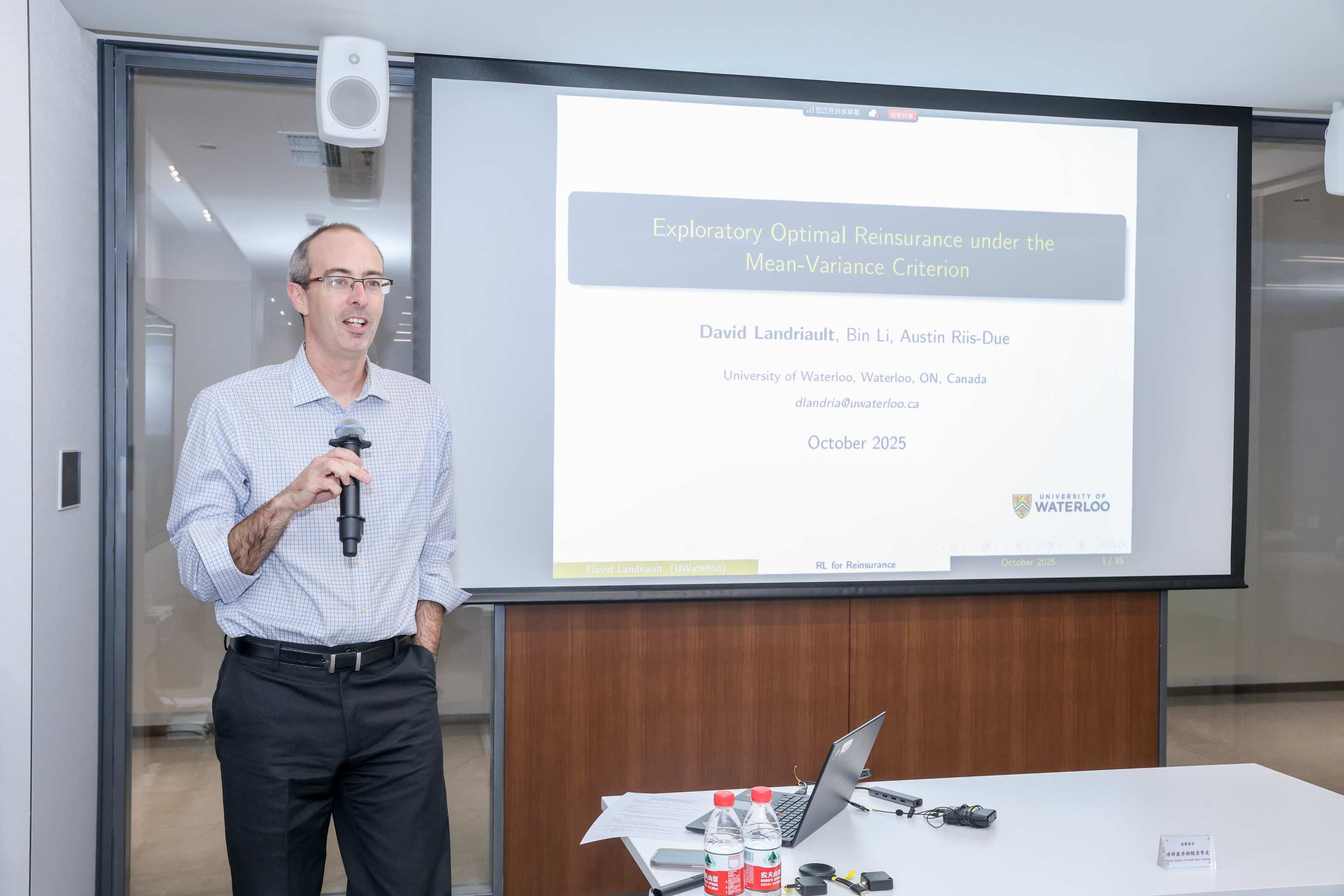 随后,滑铁卢大学教授大卫·兰德里奥(David Landriault)分享了《均值-方差准则下的探索性最优再保险》的研究成果。他采用强化学习方法,探讨了保险公司在索赔分布不确定性下的最优再保险策略,并提出了策略迭代与鞅正交性定理,为再保险决策提供了新的理论支持。